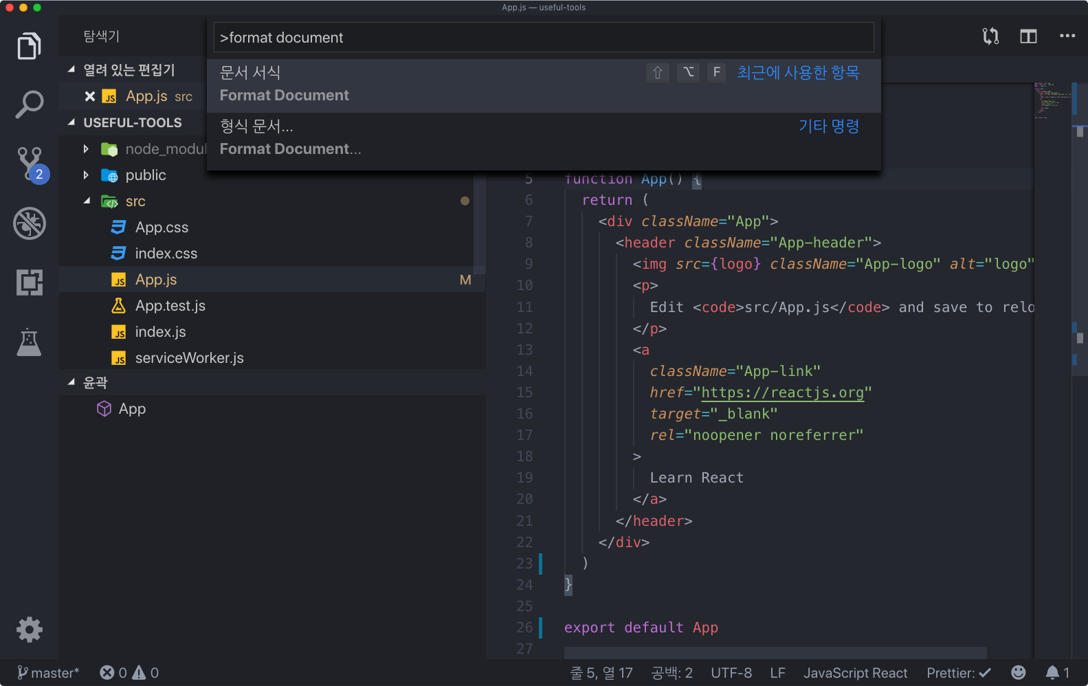 만약에 저장 할 때 마다 코드를 변형하지 않고 수동으로 해주고 싶다면 F1 키 또는 ⌘ + ⇧ + P (윈도우는 Ctrl + Shift + P) 를 눌러서 Format Document 를 입력해보세요. 그러면 이 명령을 위한 단축키도 나타날 것입니다.