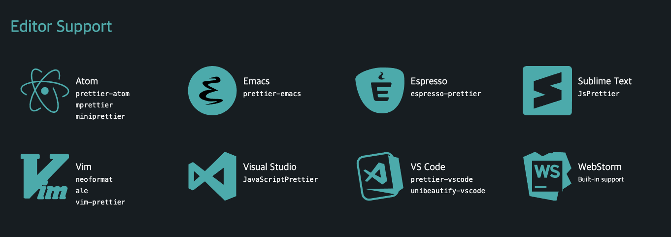 이 도구는 자바스크립트 뿐만 아니라, HTML, CSS 코드의 코드 스타일을 관리 할 수도 있고, React, Angular, Vue 등의 라이브러리도 지원 해주고 플러그인을 통하여 다른 언어도 관리해줄 수 있습니다.