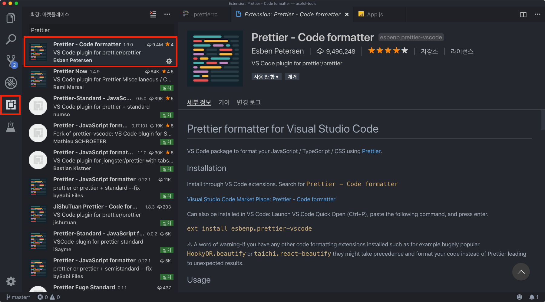 { "trailingComma": "all", "tabWidth": 2, "semi": true, "singleQuote": true }파일을 만드셨으면, 에디터에서 Prettier 익스텐션을 설치하세요.