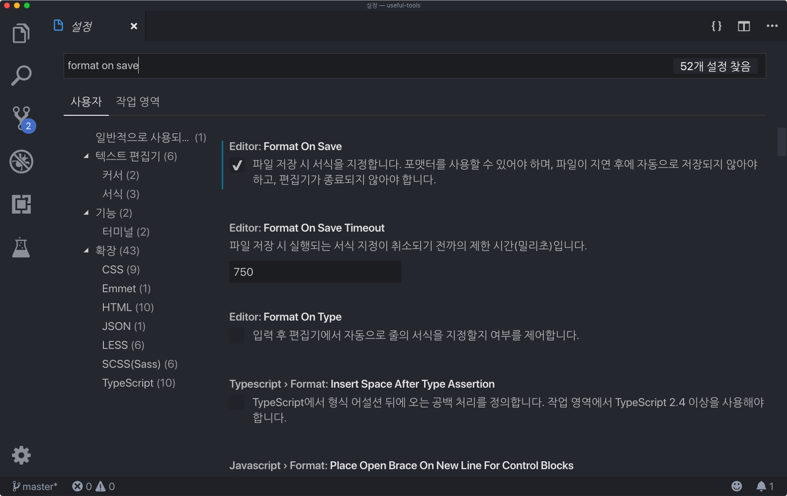 그 다음에는 ⌘ + , (윈도우/리눅스에서는 Ctrl + ,) 키를 눌러서 VS Code 환경 설정을 열은 뒤 Format On Save 검색 후 를 체크하시면 앞으로 저장 할 때마다 설정한 코딩 스타일에 따라 자동으로 코드가 변형됩니다.
