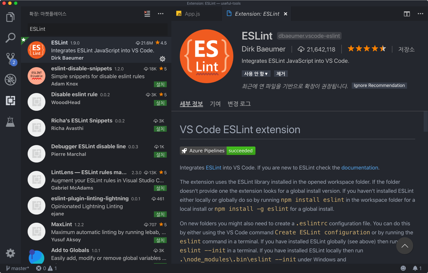 이번에는 ESLint 의 VS Code 익스텐션을 설치해보세요.