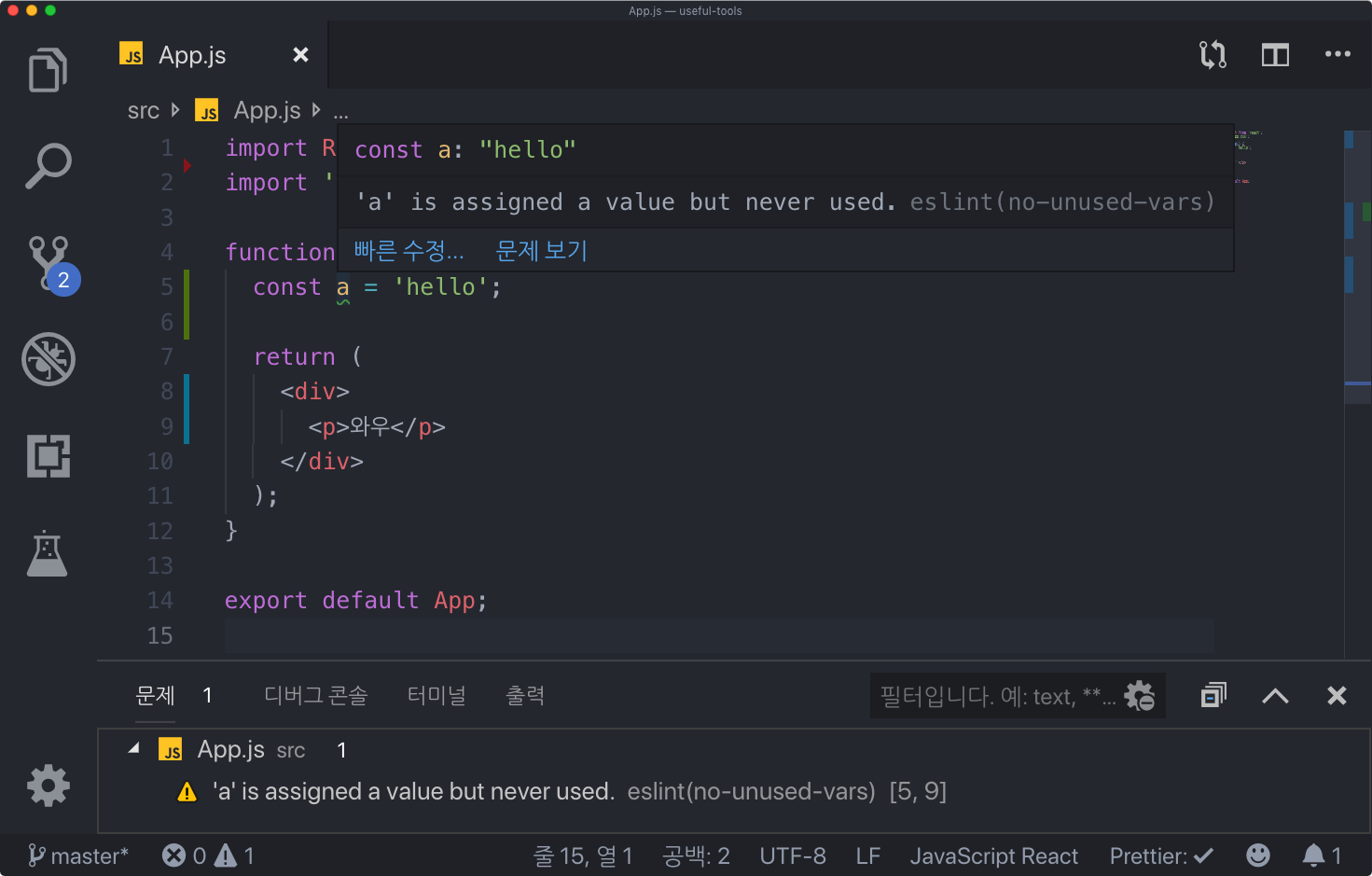 Compiled with warnings. ./src/App.js Line 5: 'a' is assigned a value but never used no-unused-vars Search for the keywords to learn more about each warning. To ignore, add // eslint-disable-next-line to the line before.ESLint 옵션