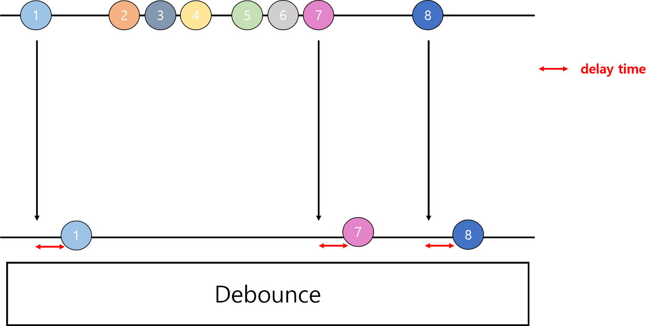 위 그림에서 1, 7, 8의 이벤트가 실행되는 것을 볼 수 있는데, 디바운스에 지정한 delay time 동안 사용자가 이벤트를 발생시키지 않았기 때문입니다. delay time보다 짧은 시간 내에 이벤트가 발생한 2, 3, 4, 5, 6 은 이벤트가 발생하지 않으며, 이것이 바로 디바운스의 특징입니다.