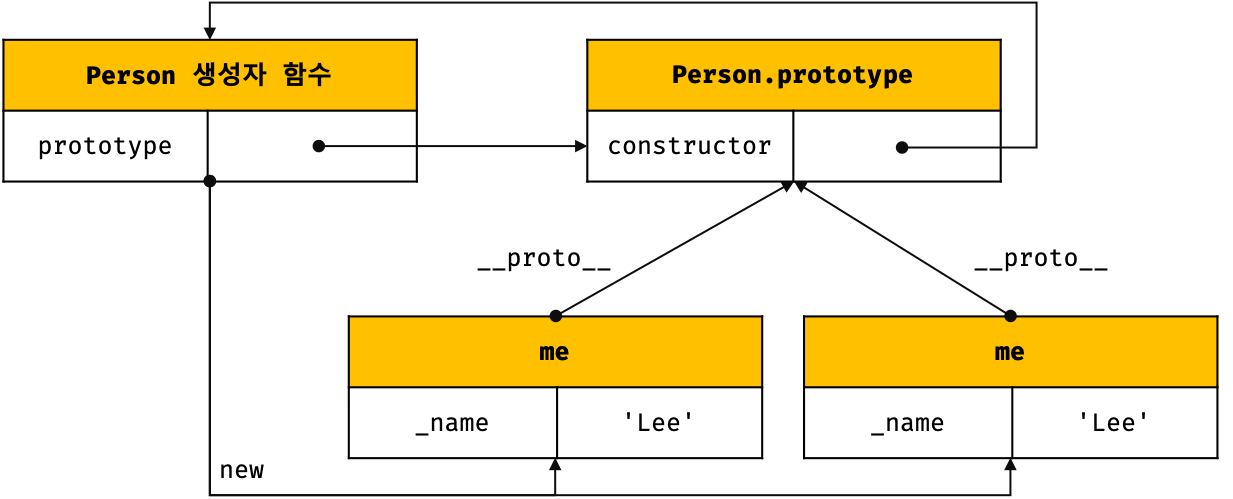 var Person = (function () { // Constructor (생성자) function Person(name) { this._name = name; } // public method Person.prototype.sayHi = function () { console.log('Hi! ' + this._name); }; // return constructor return Person; }()); var me = new Person('Lee'); me.sayHi(); // Hi! Lee. console.log(me instanceof Person); // true위 예제를 프로토타입 관점에서 표현해 보면 아래와 같다.