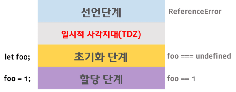 즉, 스코프에 변수를 등록(선언단계)하지만 초기화단계는 변수 선언문에 도달했을때 이루어진다. 초기화 이전의 변수에 접근하려고 하면 참조에러(ReferenceError)가 발생한다. 이는 변수가 아직 초기화되지 않았기 때문이다. 다시 말하면 변수를 위한 메모리공간이 아직 확보되지 않았기 때문이다. 따라서 스코프의 시작 지점부터 초기화 시작 지점까지는 변수를 참조할 수 없다. 스코프의 시작 지점부터 초기화 시작 지점까지의 구간을 ‘일시적 사각지대(Temporal Dead Zone; TDZ)‘라고 부른다.
