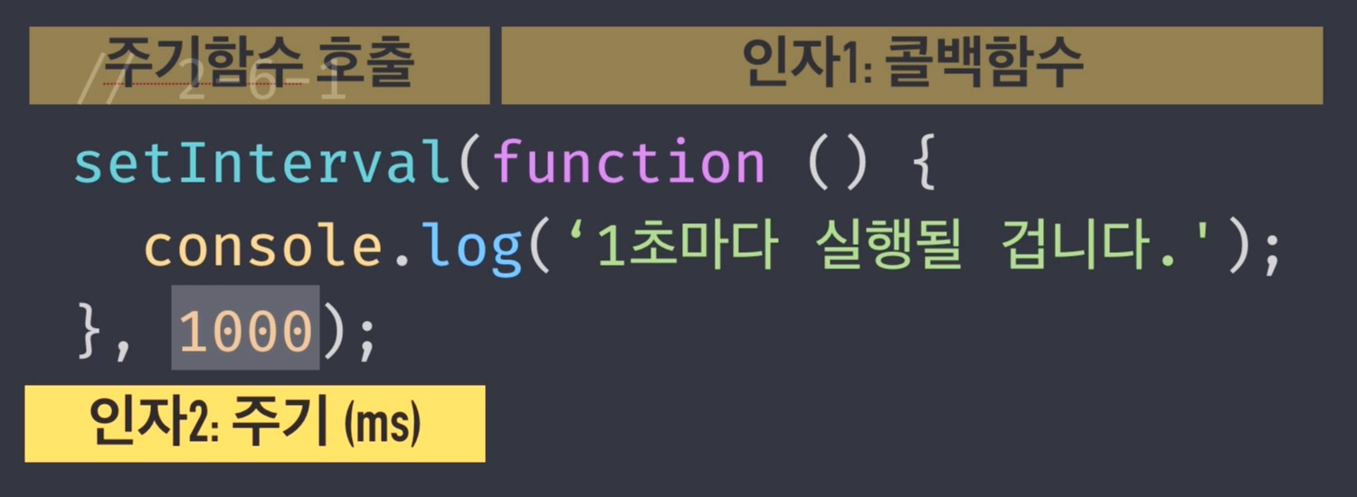 var cb = function(){ console.log("1초마다 실행됩니다."); } setInterval(cb, 1000);# setInterval(callback, milliseconds) 의 MDN 정의