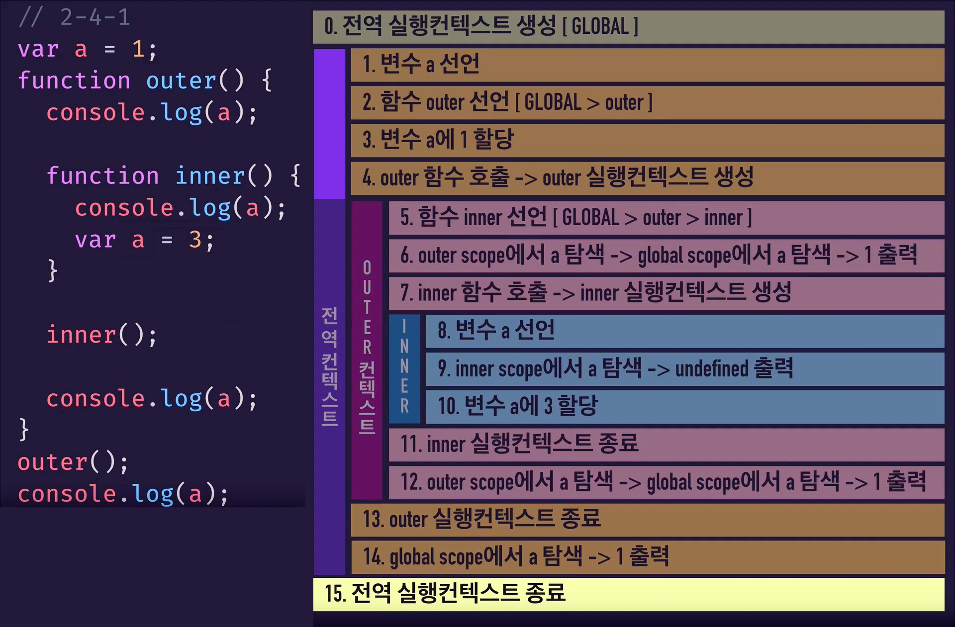 # 왼쪽에 작성한 코드는 변수와 함수의 선언이 위로 올라가면서 자바스크립트 엔진이 실제로 실행할 코드는 오른쪽이 된다.